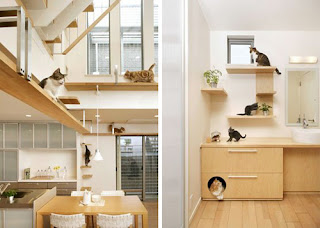 I think I'm going to be a heart attack, this is the best thing I've ever seen! As you may know, the Japanese treat their pets like children, and because they are also masters of good design, it's no surprise that some of the Japanese house builders are now designing homes for pets with special features. These pictures are amazing by Asahi Kasei Plus-Nyan house. Apparently, a lot of research went into designing these beautiful rooms, from the point of view of cats and homeowners.
